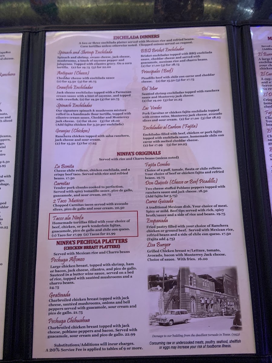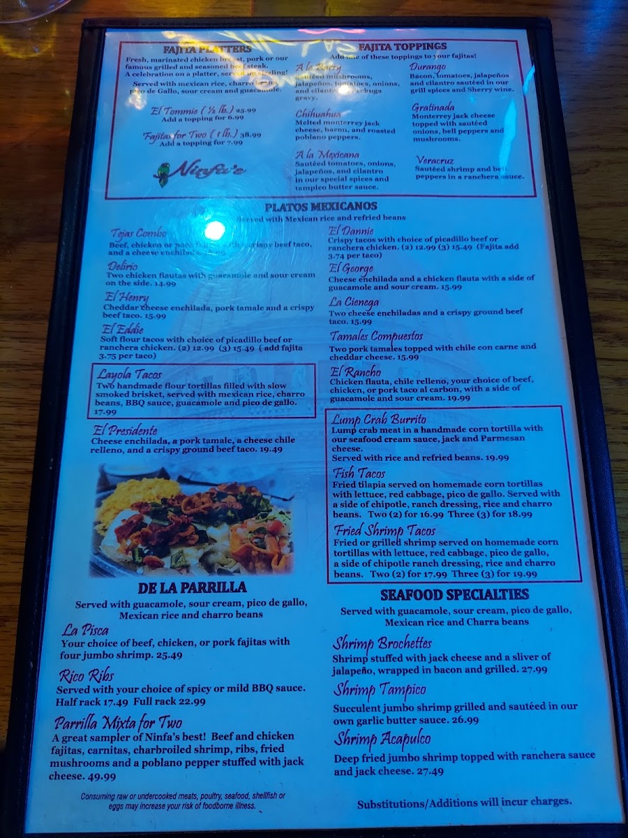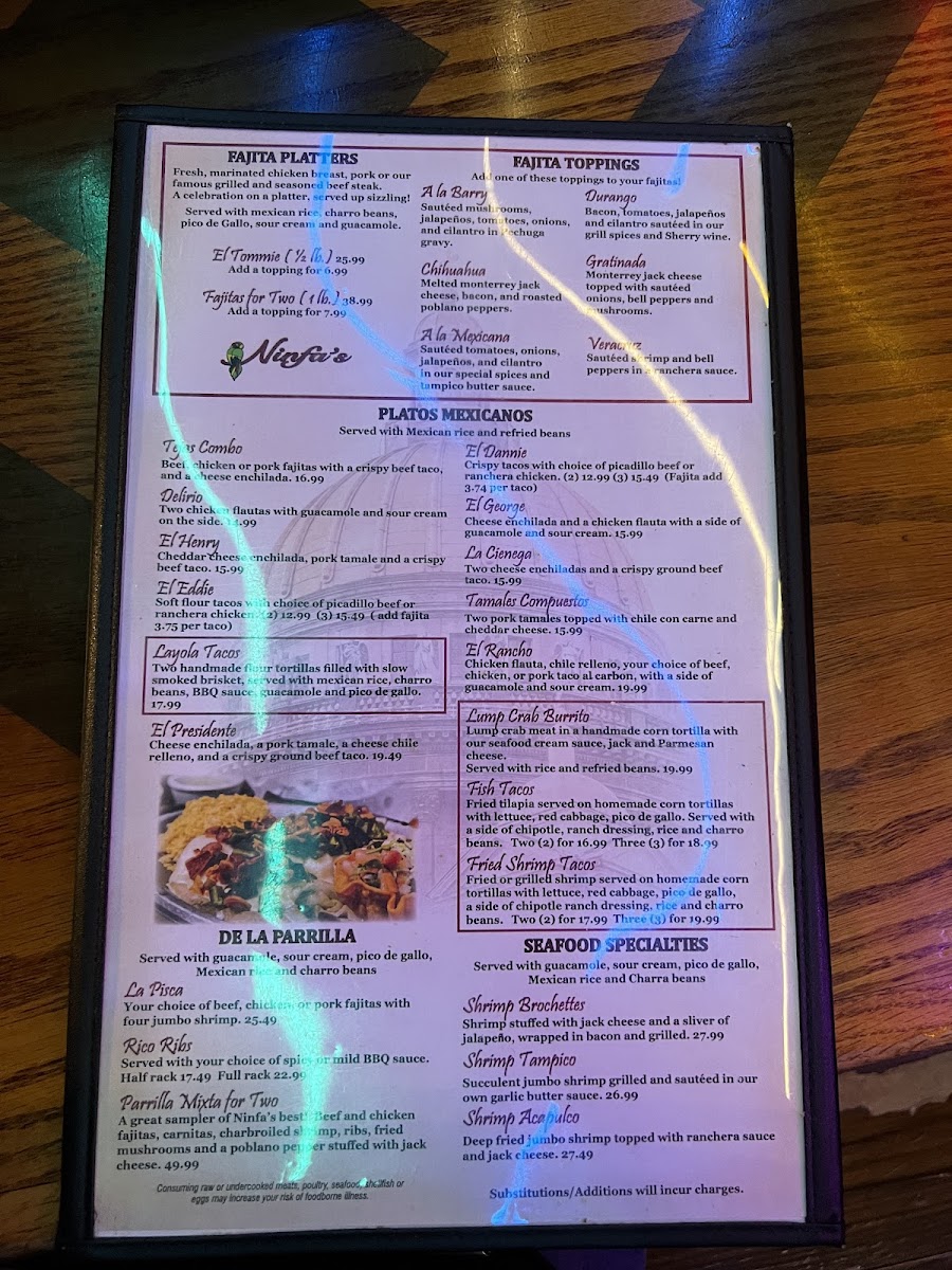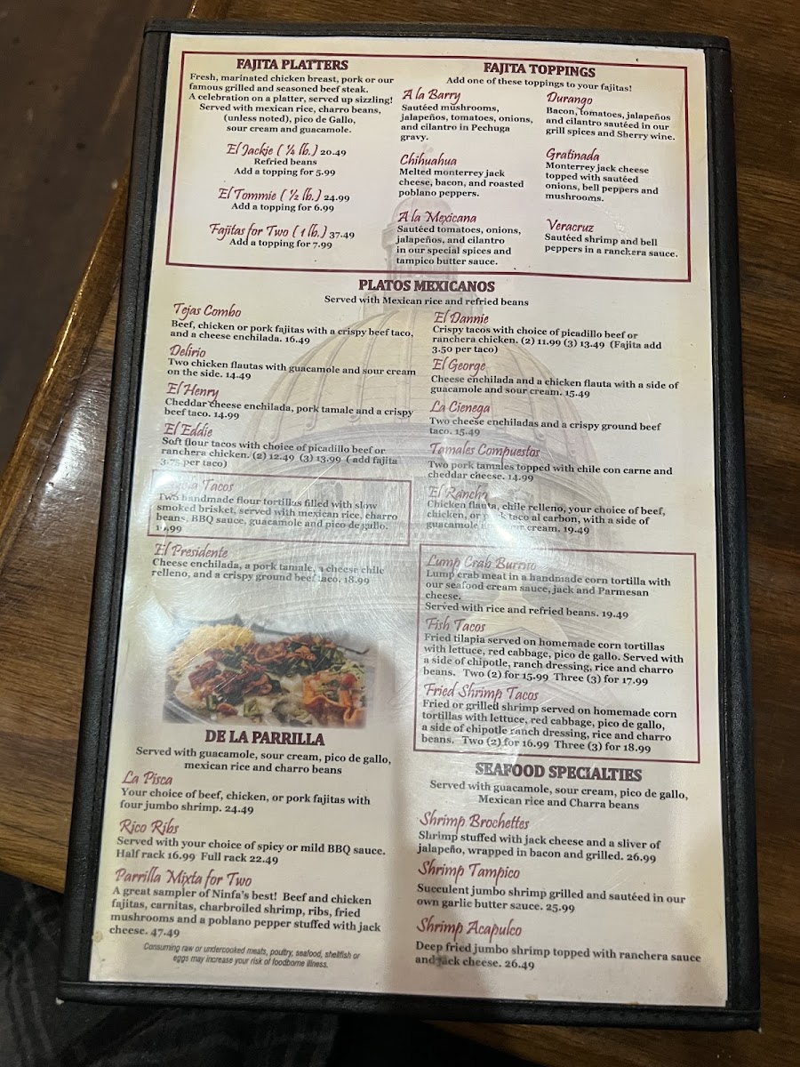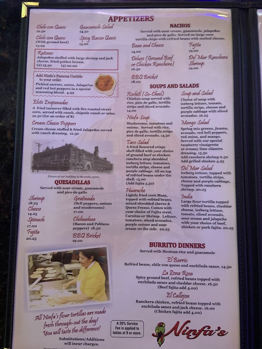 Sampler of all Ninfa’s Best! Beef & Chicken Fajitas, Carnitas, Charbroiled Shrimp, Pork Ribs, Fried Mushrooms, and a Poblano Pepper stuffed with Jack Cheese. Served with Guacamole, Sour Cream, Pico de Gallo, Mexican Rice and Refried Beans. Available for up to 4 people! (Photo reflects a Parrilla Mixta for 2)
