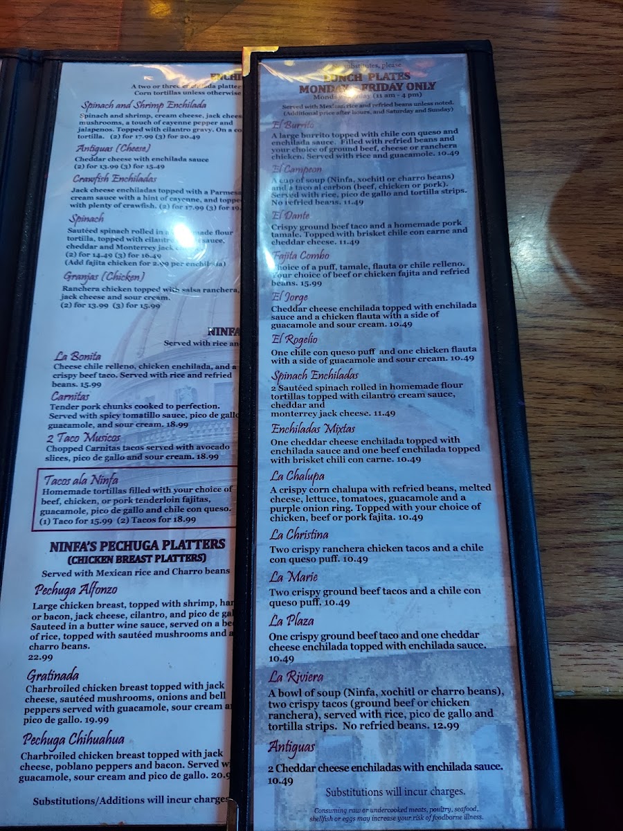 Spinach and shrimp, cream cheese, jack cheese, mushrooms, a touch of cayenne pepper, topped with cilantro gravy. Served with Mexican rice and refried beans. Chopped onions served on request.