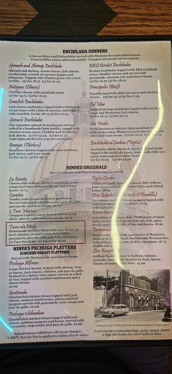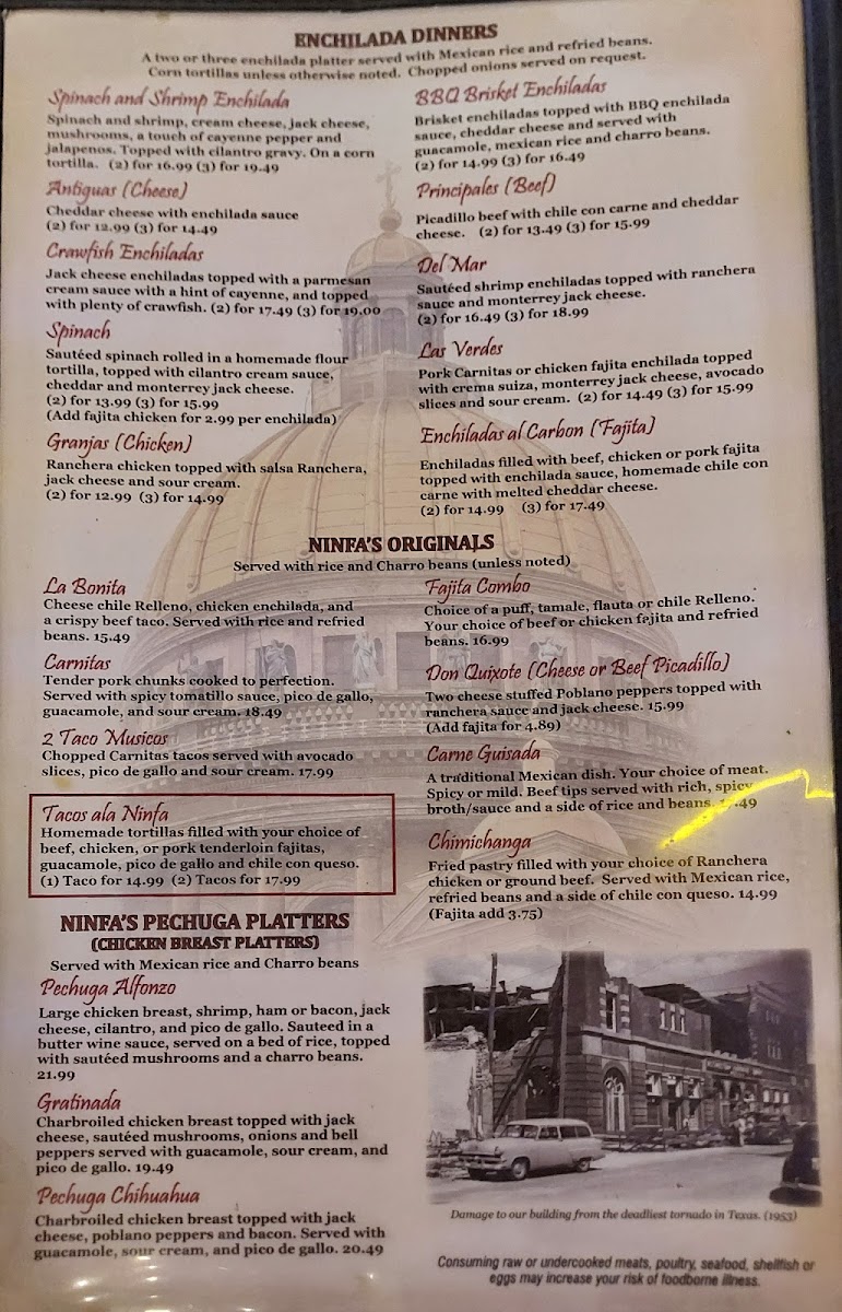 Jack cheese enchiladas topped with a Parmesan cream sauce with a hint of cayenne pepper and topped with crawfish. Served with Mexican rice and refried beans. Chopped onions served on request.